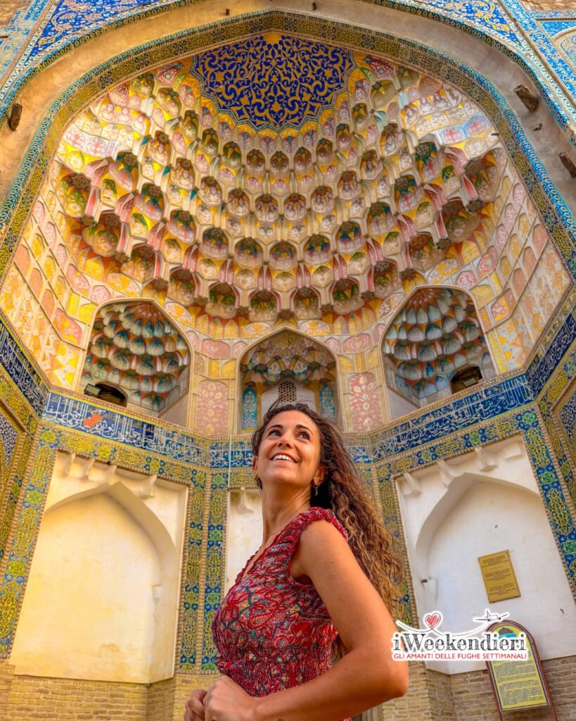 Se dovessi descrivere l’Uzbekistan con un’immagine, sarebbe questa, una luce calda che cade su pareti color miele e, in mezzo, un blu intenso che non è un blu qualsiasi, è quel blu smaltato, timuride, che ti rimane negli occhi per giorni.